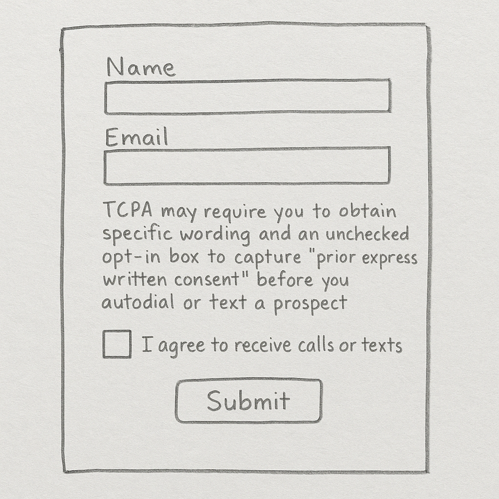 Now, complying with these laws isn’t just a checkbox (literally and figuratively). It impacts how you design your lead capture process. For example, TCPA might require you to include specific wording and an unchecked opt-in box to capture “prior express written consent” before you autodial or text a prospect.