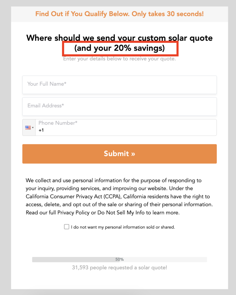 Another trick to keep your prospect hooked is to reiterate the value of your offer before they see the CCPA section. Highlight what they will gain to make it a win-win for them to share their info.