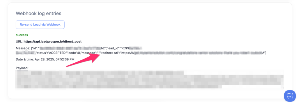 Once your webhook is configured, submit a test lead. Then, within your LeadCapture.io account, go to the lead details page and select the specific lead. Scroll down to find the section displaying the full webhook response from your receiving system. Here, you’ll locate the redirect URL field.