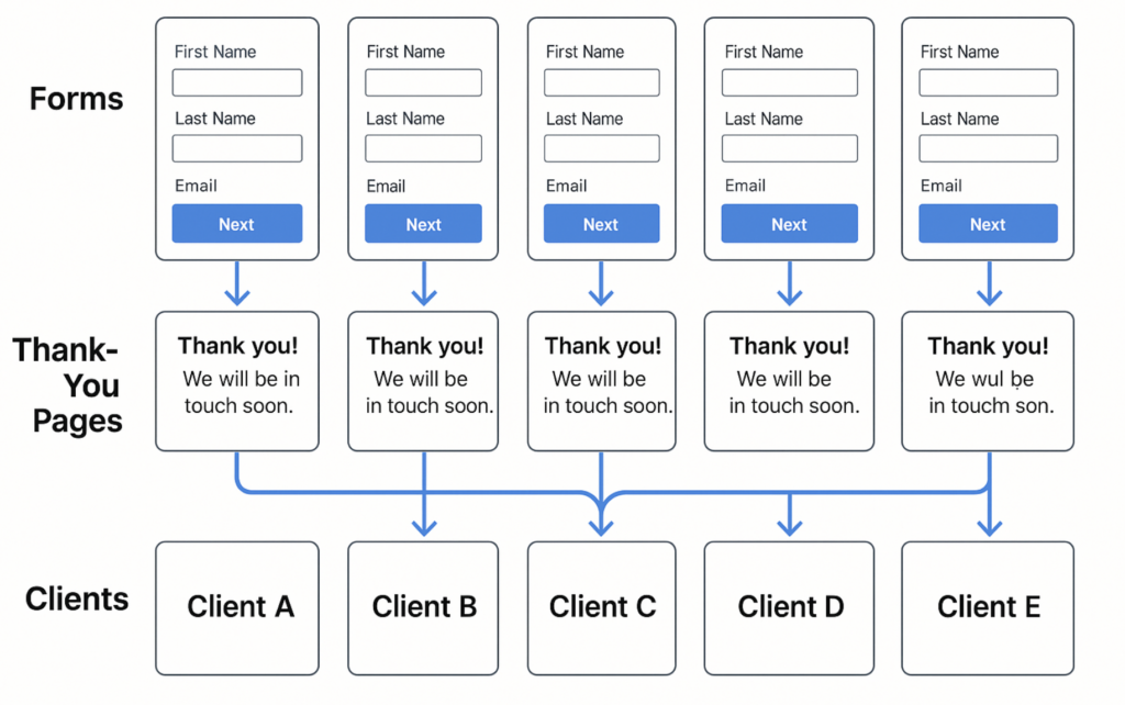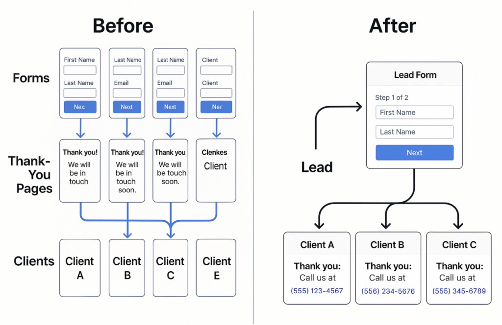 Now imagine you’re routing leads to 50 or 100 different lead buyers or clients. That’s 50–100 forms, landing pages, and post-submit redirects.