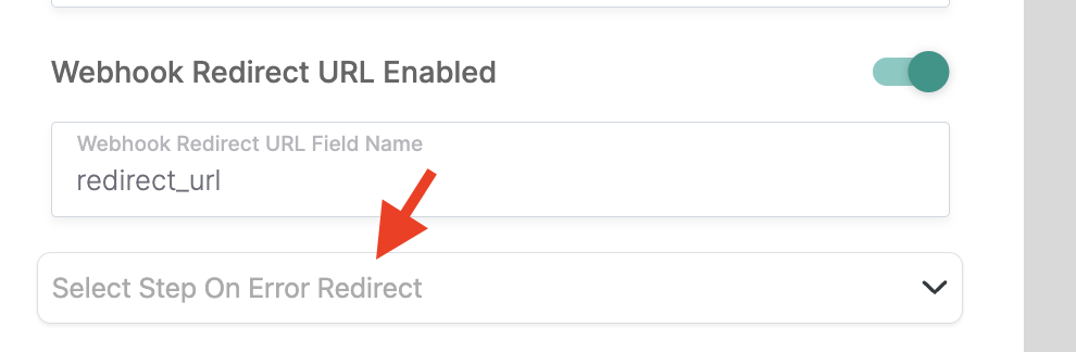 In the Webhook section, toggle the “Webhook Redirect URL Enabled” option to activate it, and then input the value you previously copied into the “Webhook Redirect URL Field Name,” which is redirect_url in this scenario.