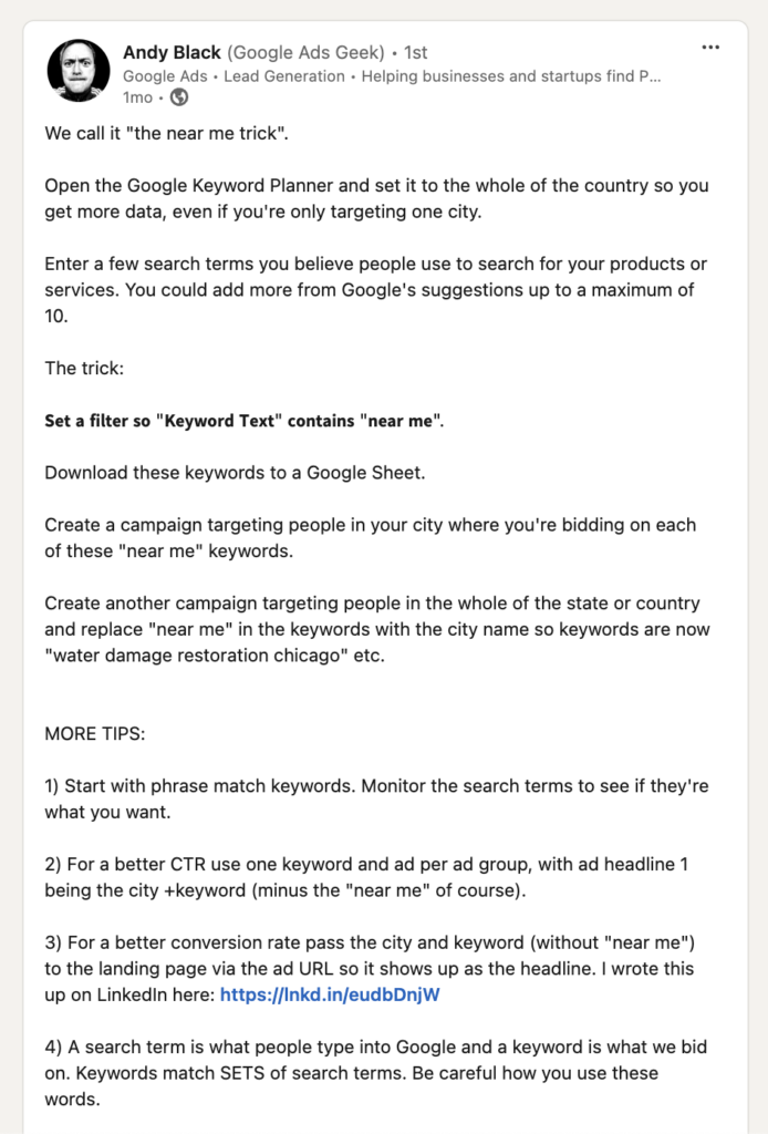 For local service businesses we use what I call the “near me” trick. We set the location to the whole country, add up to 10 keywords (search terms!) we think people use and set a filter so we only see ones that contain “near me”.