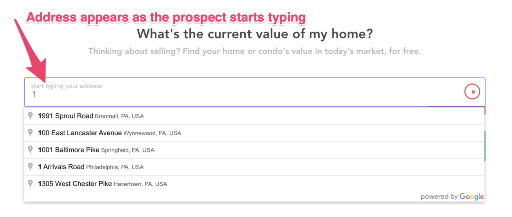 Next, as prospects type in their address, they’ll notice an autocomplete feature.