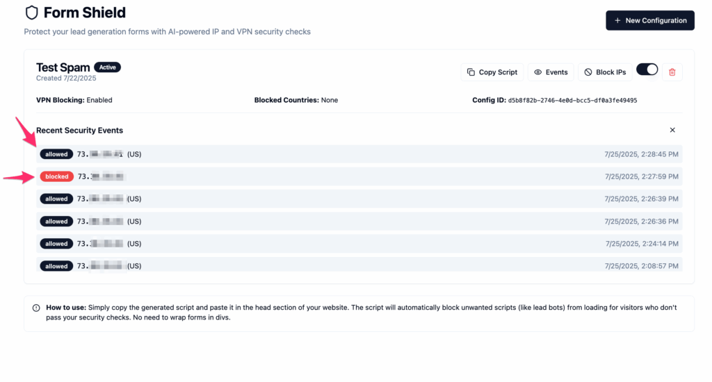 Every time a form is blocked, allowed, or accessed, Form Shield logs the event. You can view these logs in the Events tab to monitor which IPs are being blocked and why.