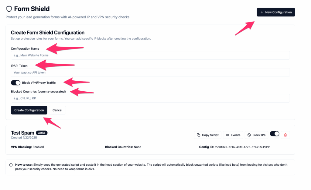 Inside Form Shield, click “New Configuration.” You’ll be prompted to: