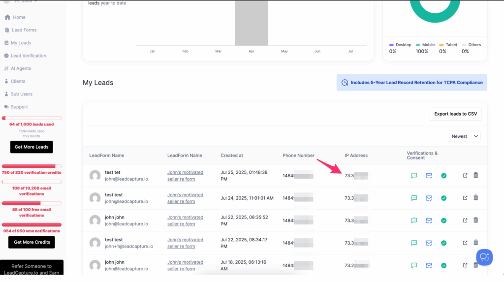 Inside your LeadCapture.io dashboard, go to the lead form you want to protect. Open up recent submissions and check the IP address of each lead.
