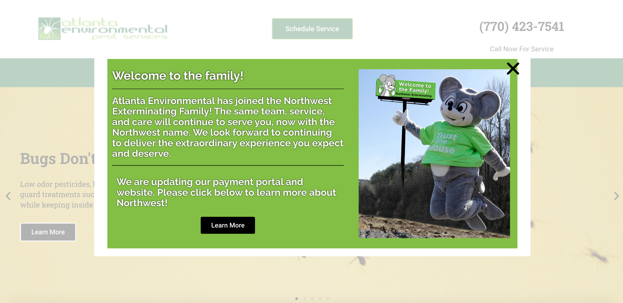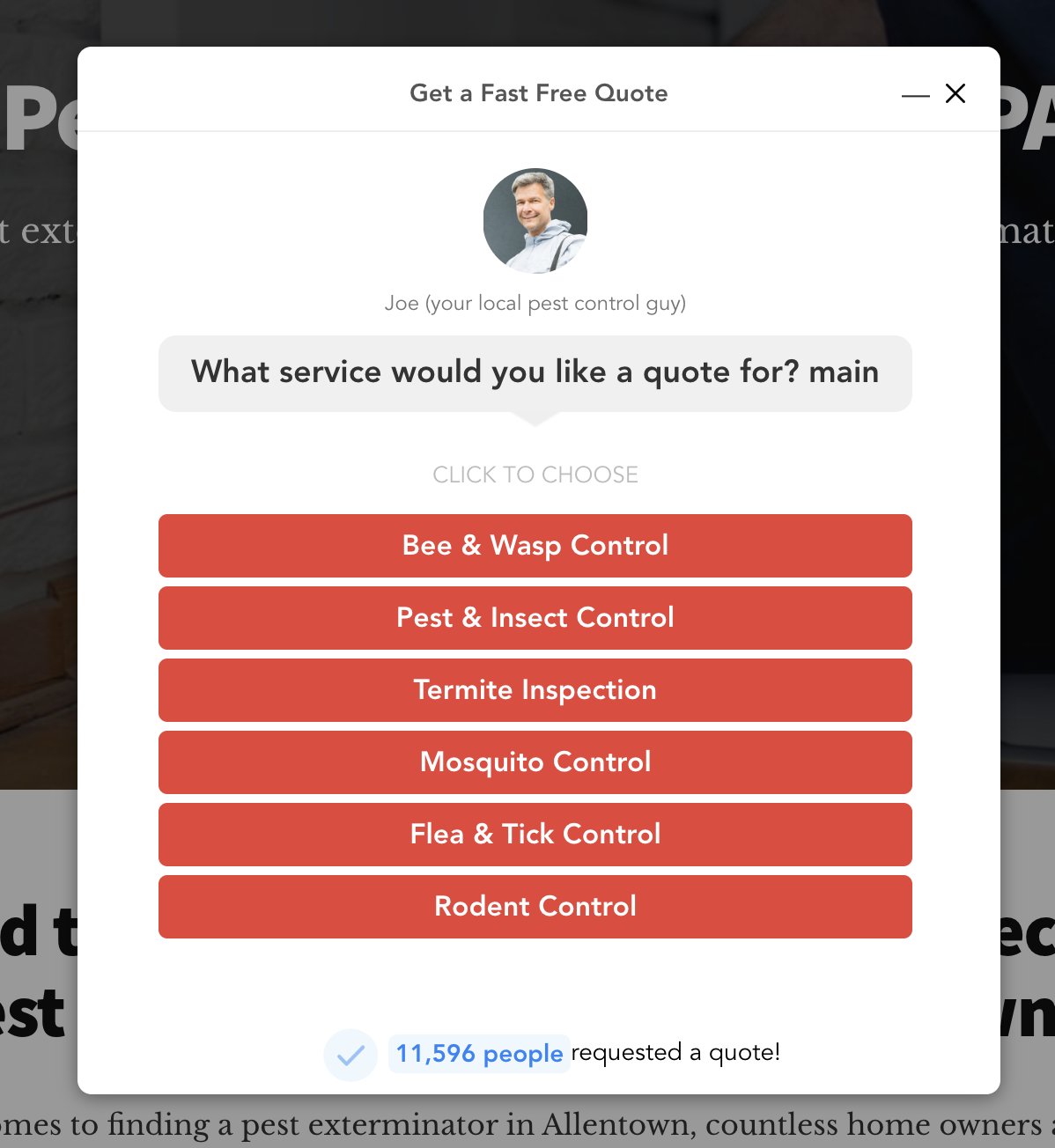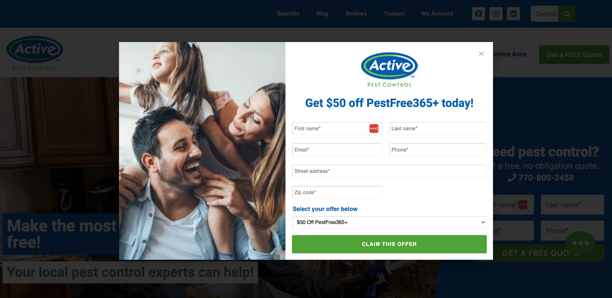 For instance, as soon as visitors land on this pest control company’s website, they get hit with this popup that doesn’t even apply to a large portion of the audience.