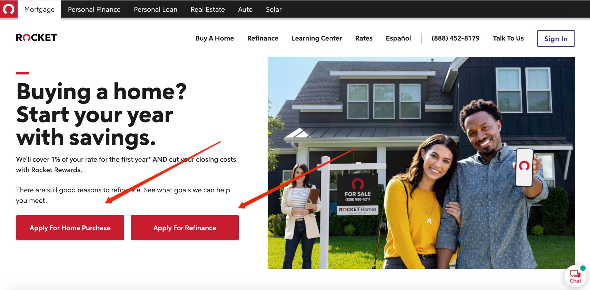 First, Rocket Mortgage has two simple, straightforward CTAs above the fold on their homepage, showing visitors where to apply for a home purchase or apply for refinance.