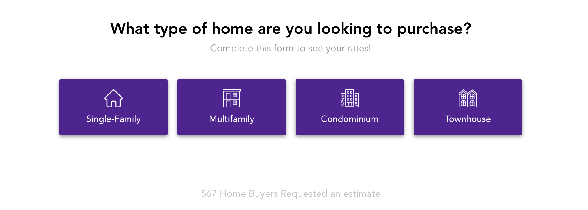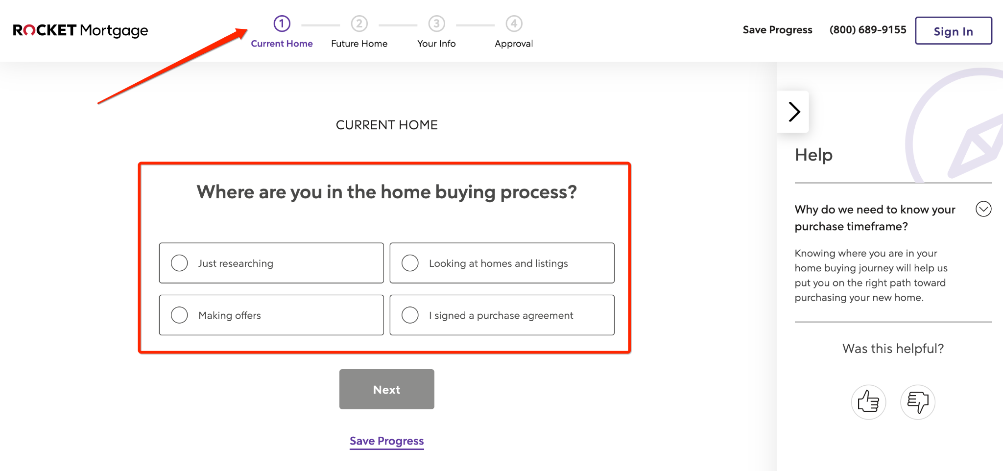 After clicking the link, they’re taken to this multi-step form which starts by asking them where they’re currently at in the home-buying process.