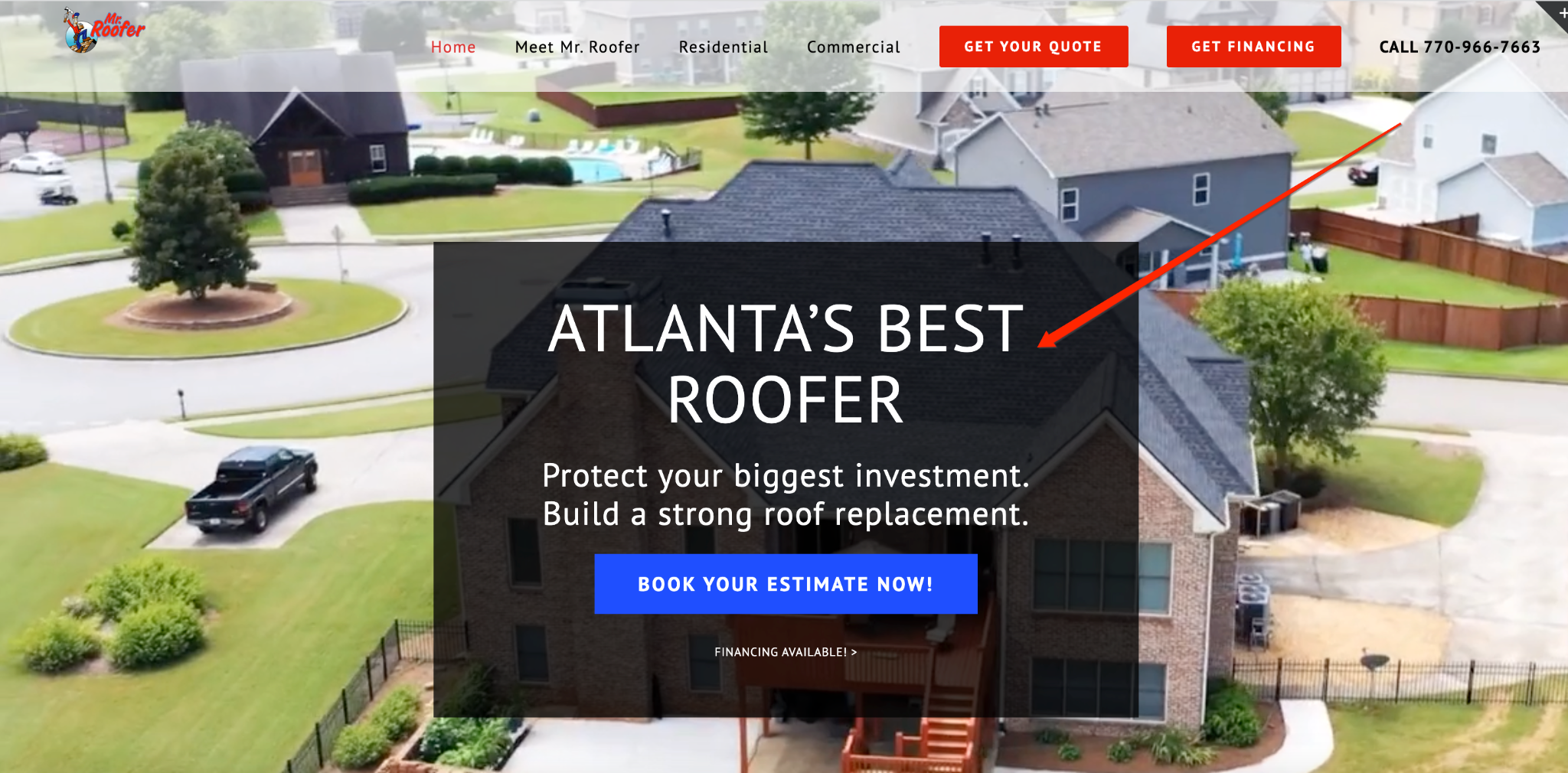 Mr. Roofer of Atlanta is a great example of how to build a lead generation website for local services with their crystal clear header above the fold.