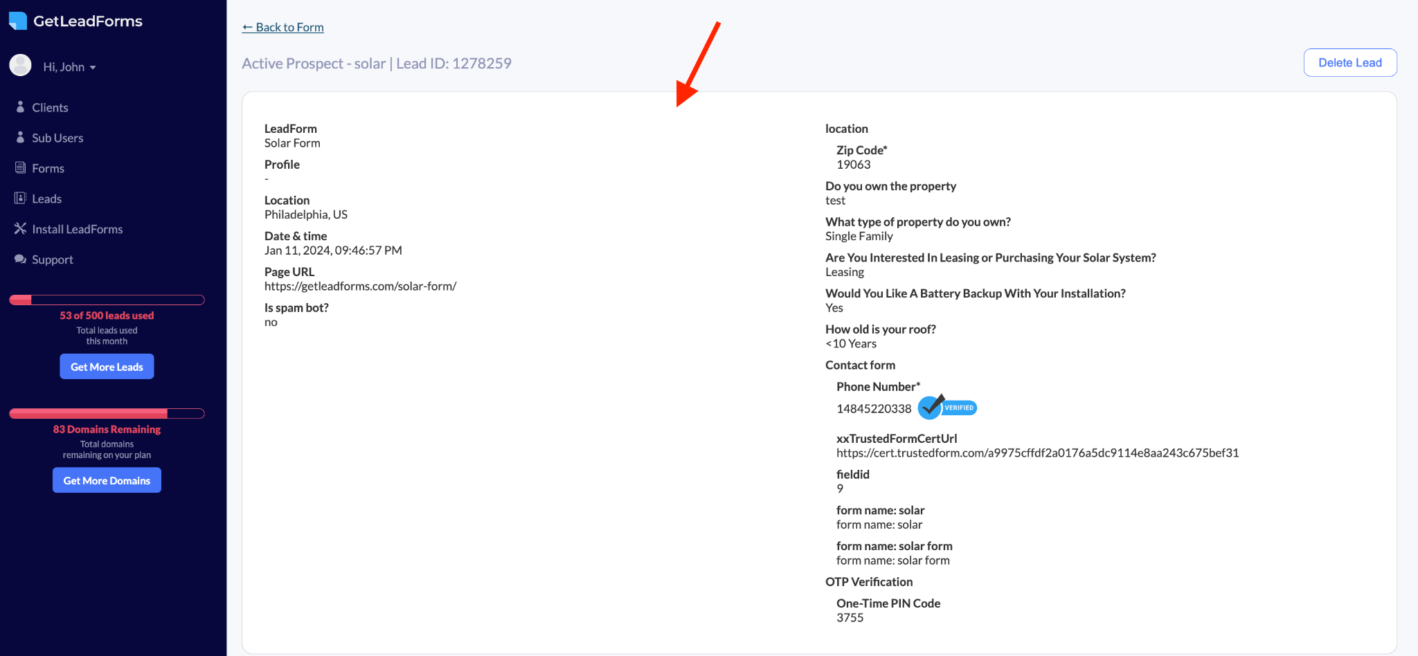 Moreover, the phone number provided has gone through OTP verification – giving our client the confidence that this lead is real.