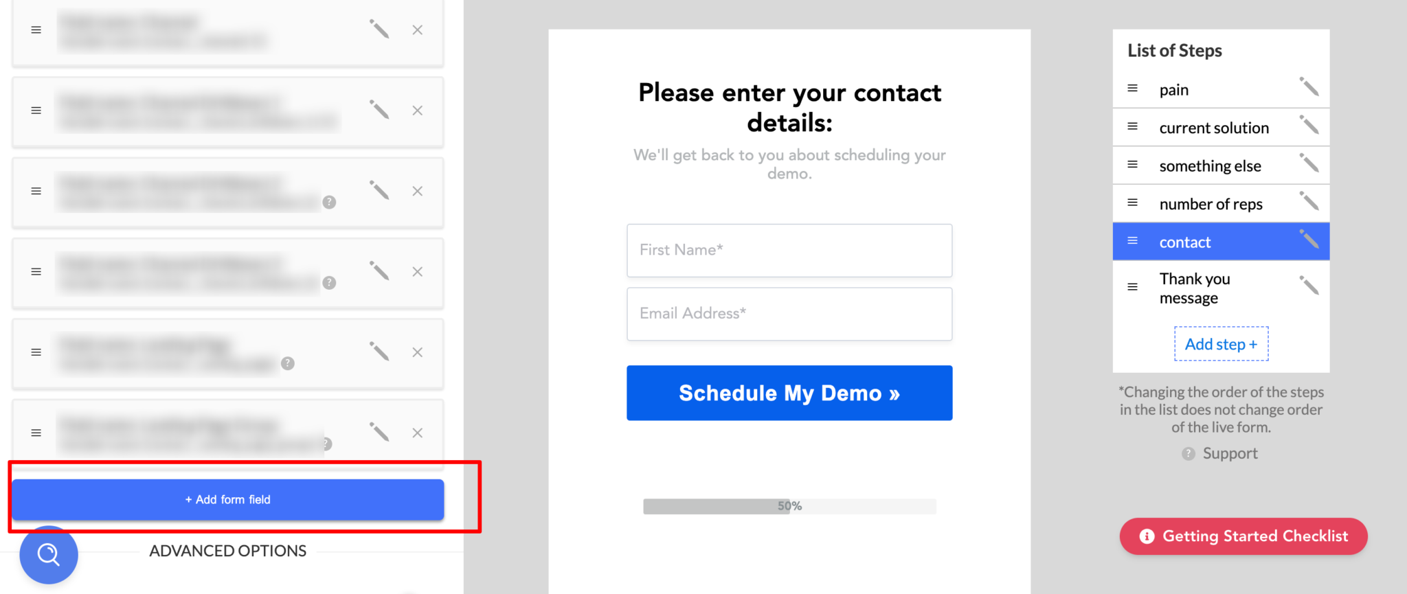 Navigate to the form you want to capture marketing attribution data in and select the step that contains your form. Add 6x new fields to the bottom of the form and follow these instructions to configure them.