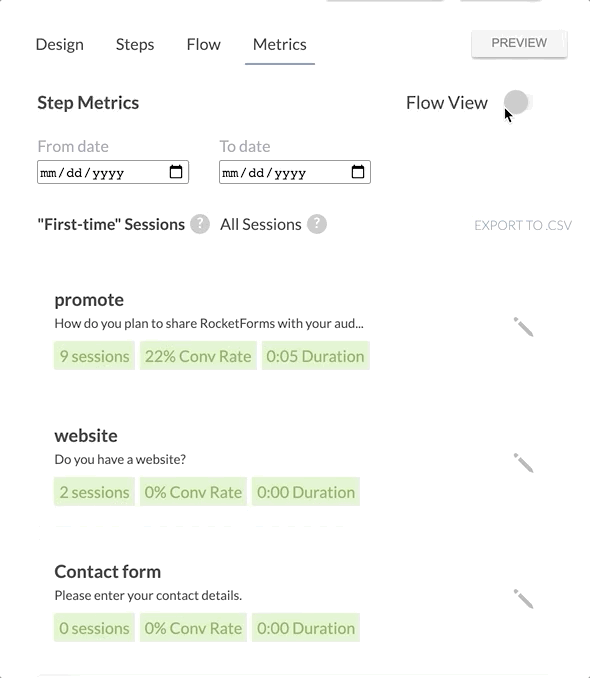 Inside of the Metrics Tab, you’ll see a list of every step of your form, with metrics associated with each step.