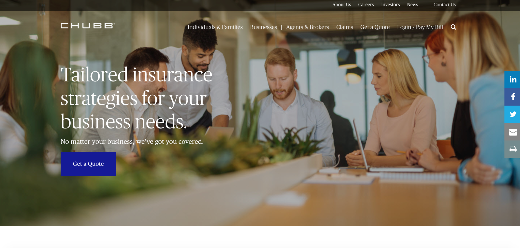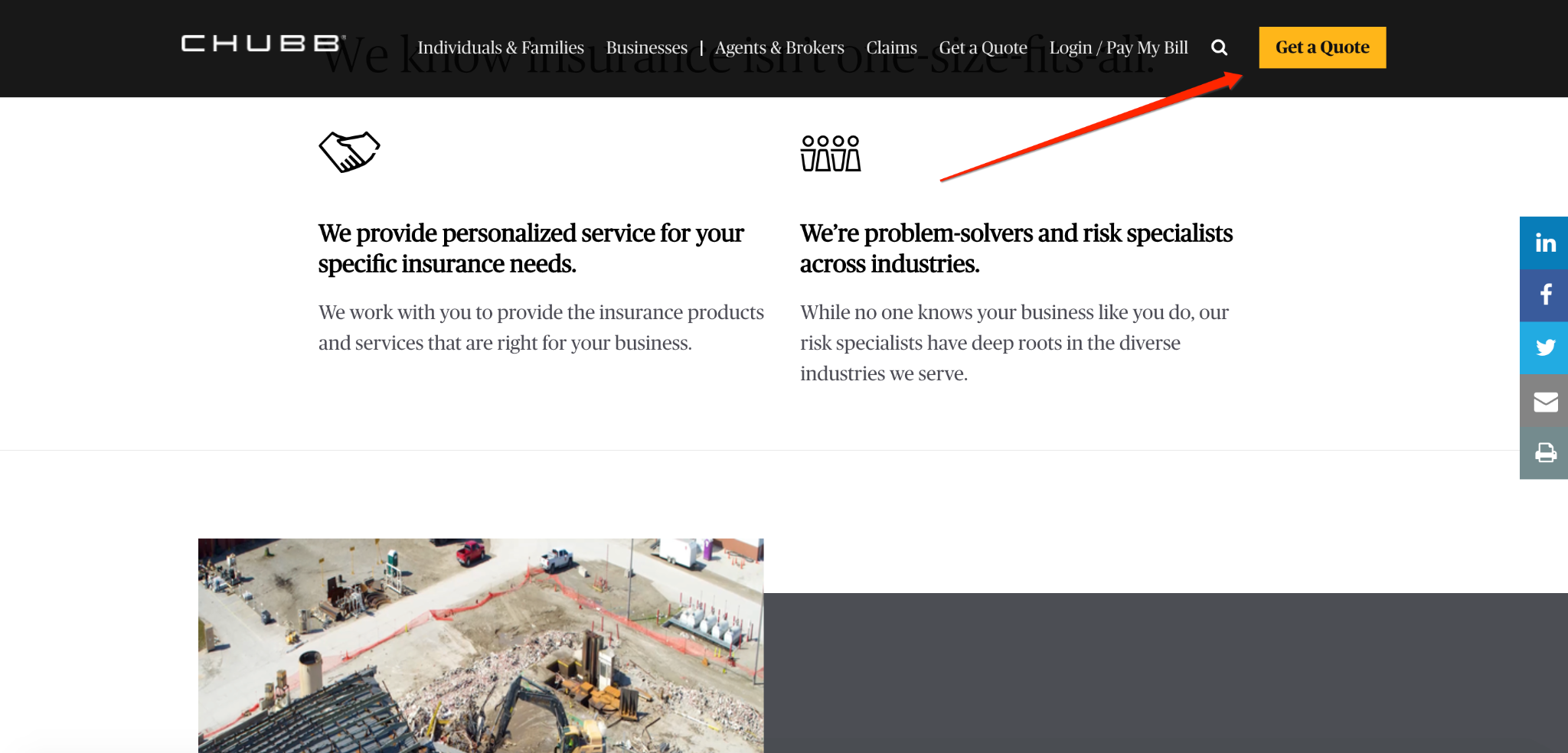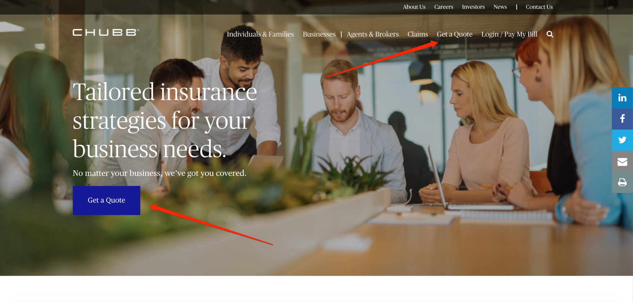 Chubb’s main goal is to get visitors to ask for a quote, so they have multiple CTAs throughout their site, including these two.