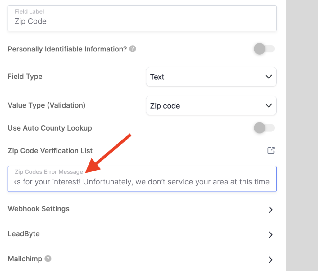 When you enable the disqualification setting, LeadCapture.io will let you define a message to show users who enter a ZIP code that is not on your allowed list.