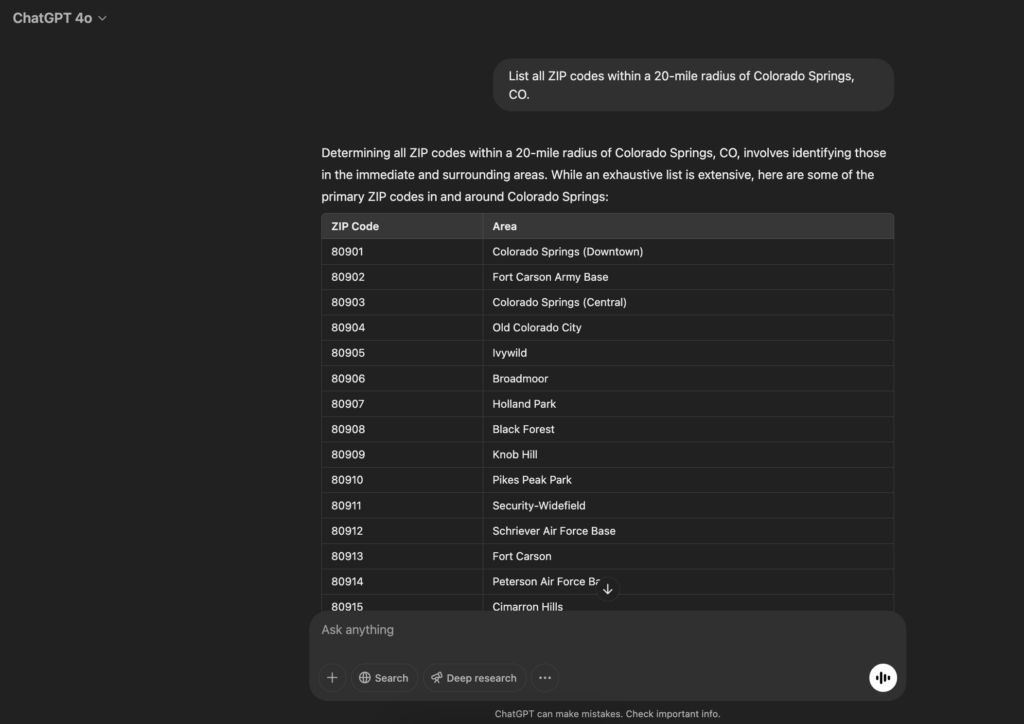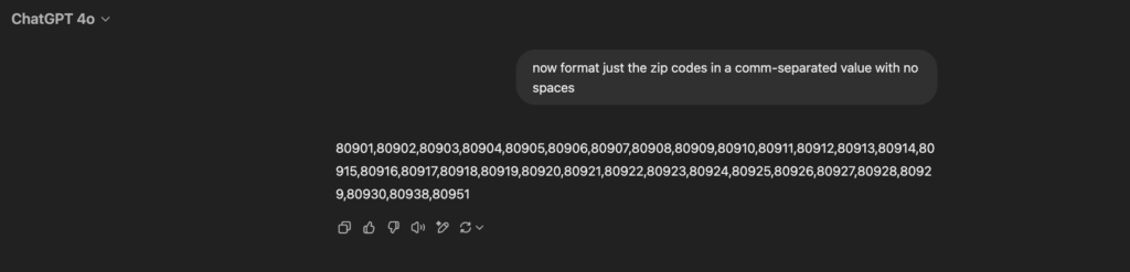 💡 Pro tip: literally ask _“What ZIP codes are in Denver, CO?” or “_List all ZIP codes within a 20-mile radius of Colorado Springs, CO. And you’ll get a quick list that you can copy.) The goal here is to have a comprehensive list of the locations you actually serve.