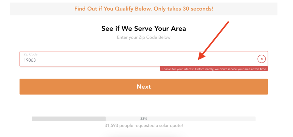 For example, you’ll see below when I entered a zip code that’s not in a serviceable location, the verification failed in real time and a friendly message was presented to the prospect.