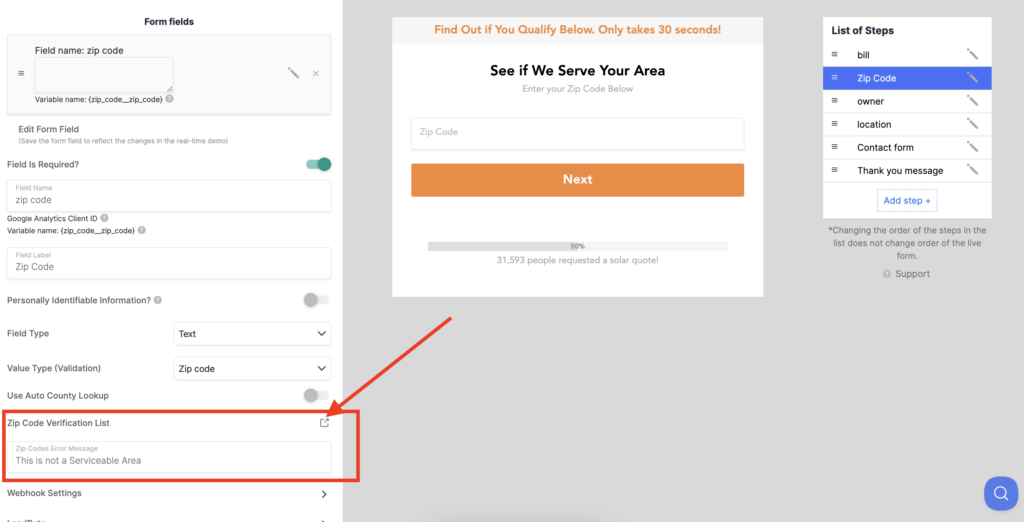 Add a ZIP/Postal Code field to your form (if you haven’t already) – this might be one of your multi-step form questions, likely right after you ask for the prospect’s basic info.