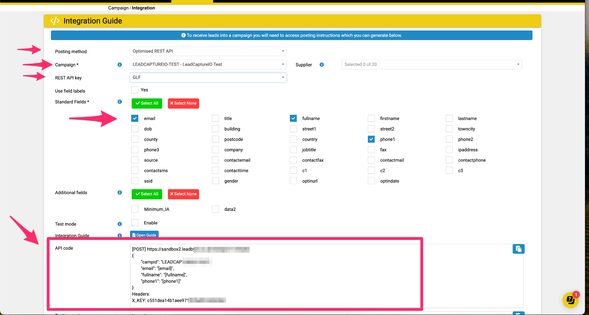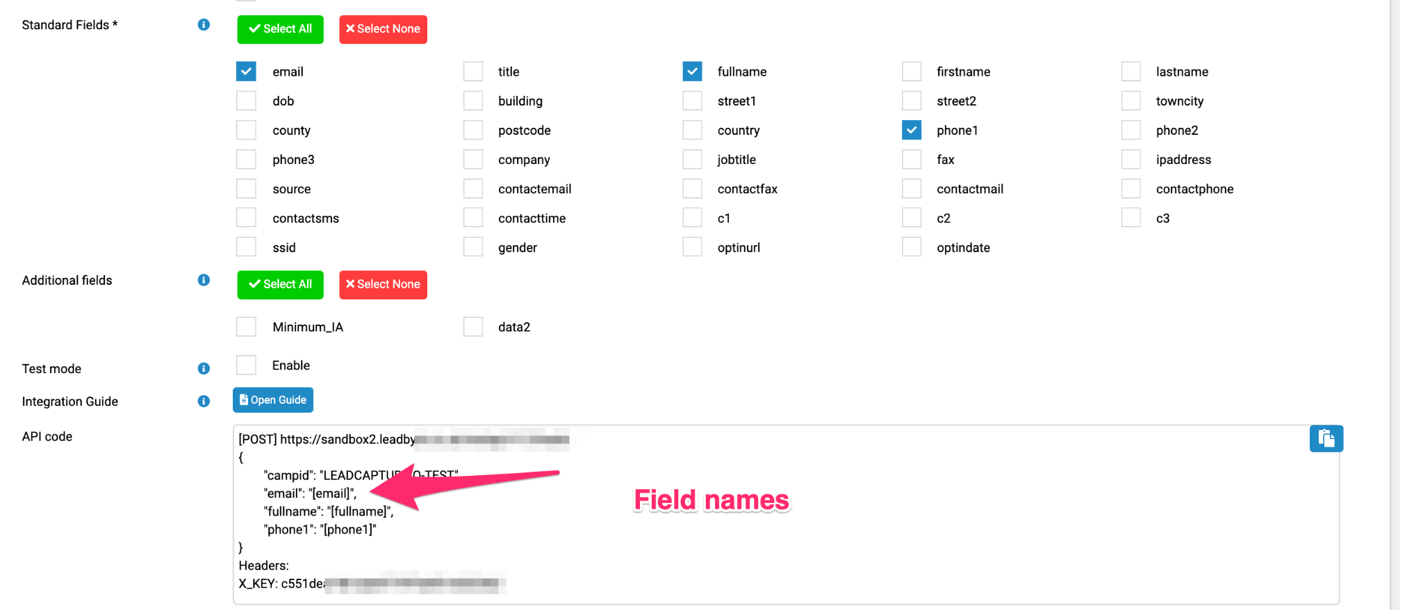 - Select the Standard and Additional fields that you’d like to capture and post into your LeadByte Campaign