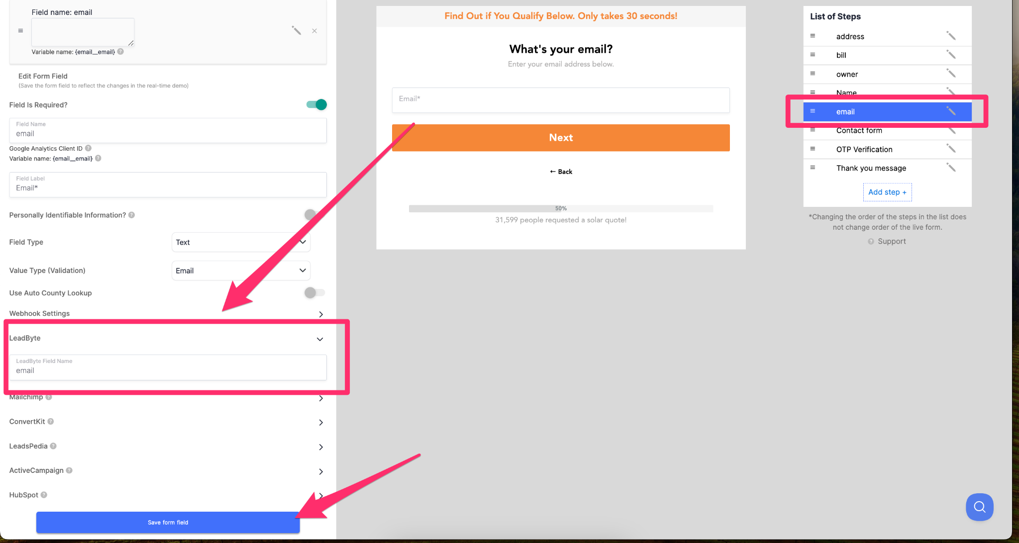In LeadCapture.io, click on the email step, then select the email field. Scroll down and input the corresponding field name from LeadByte into the LeadByte field name section, and click “Save” to complete the setup.