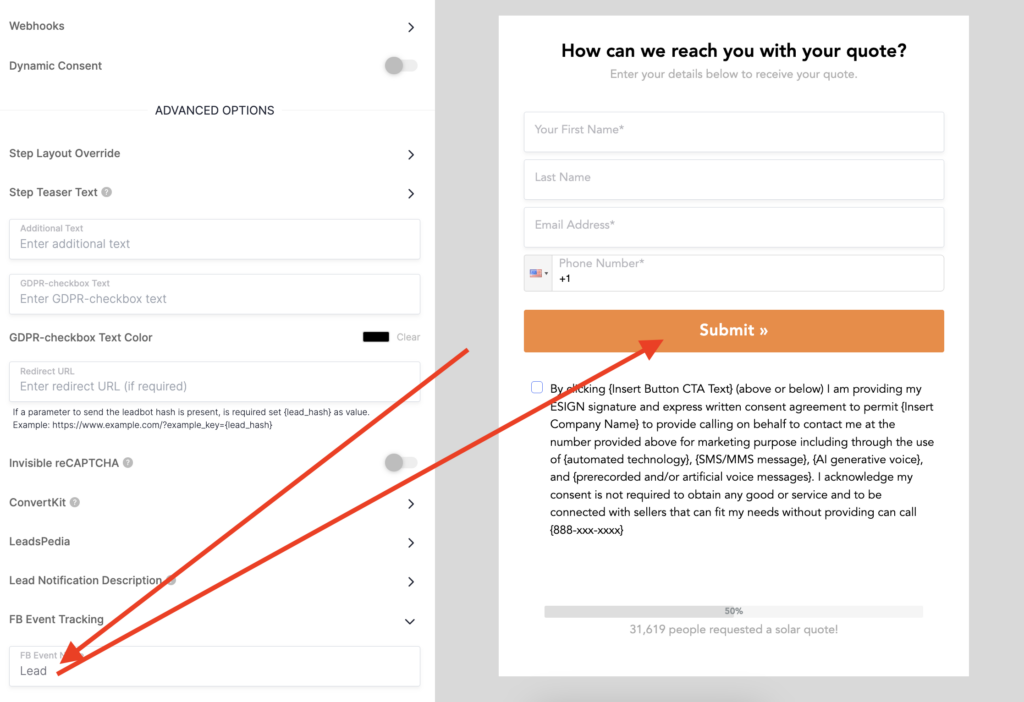 Even better, you can set these events to fire at different points in your lead flow. Submit buttons, phone or email verification, or even when someone selects a specific answer in your survey.