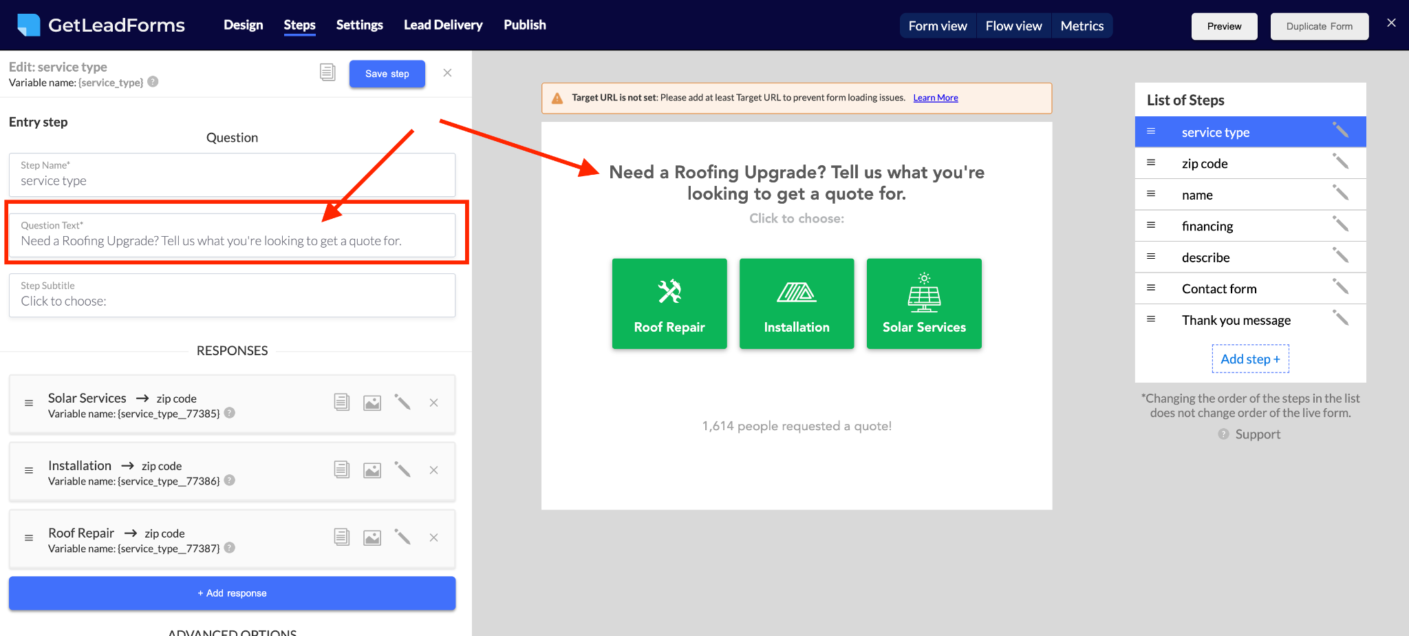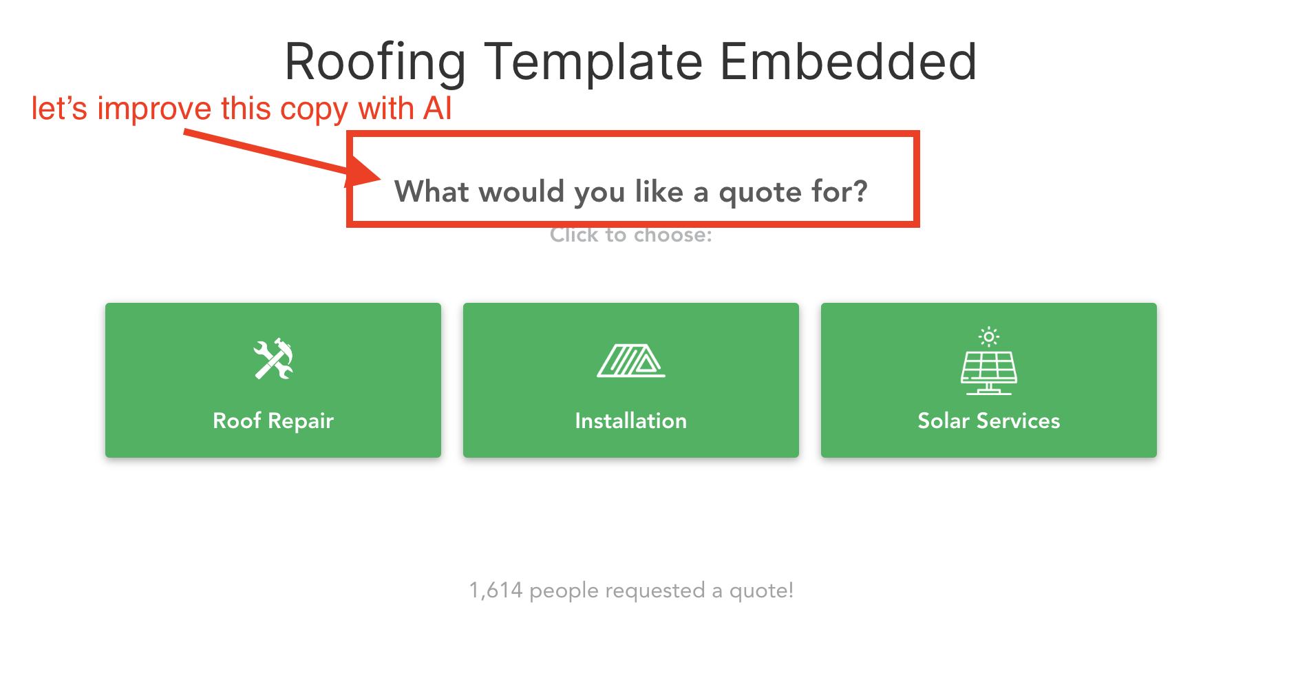 To illustrate this, let’s take a look at a roofing template offered by GetLeadForms. Upon initial review, I noticed that the copy in this form could use some improvement.