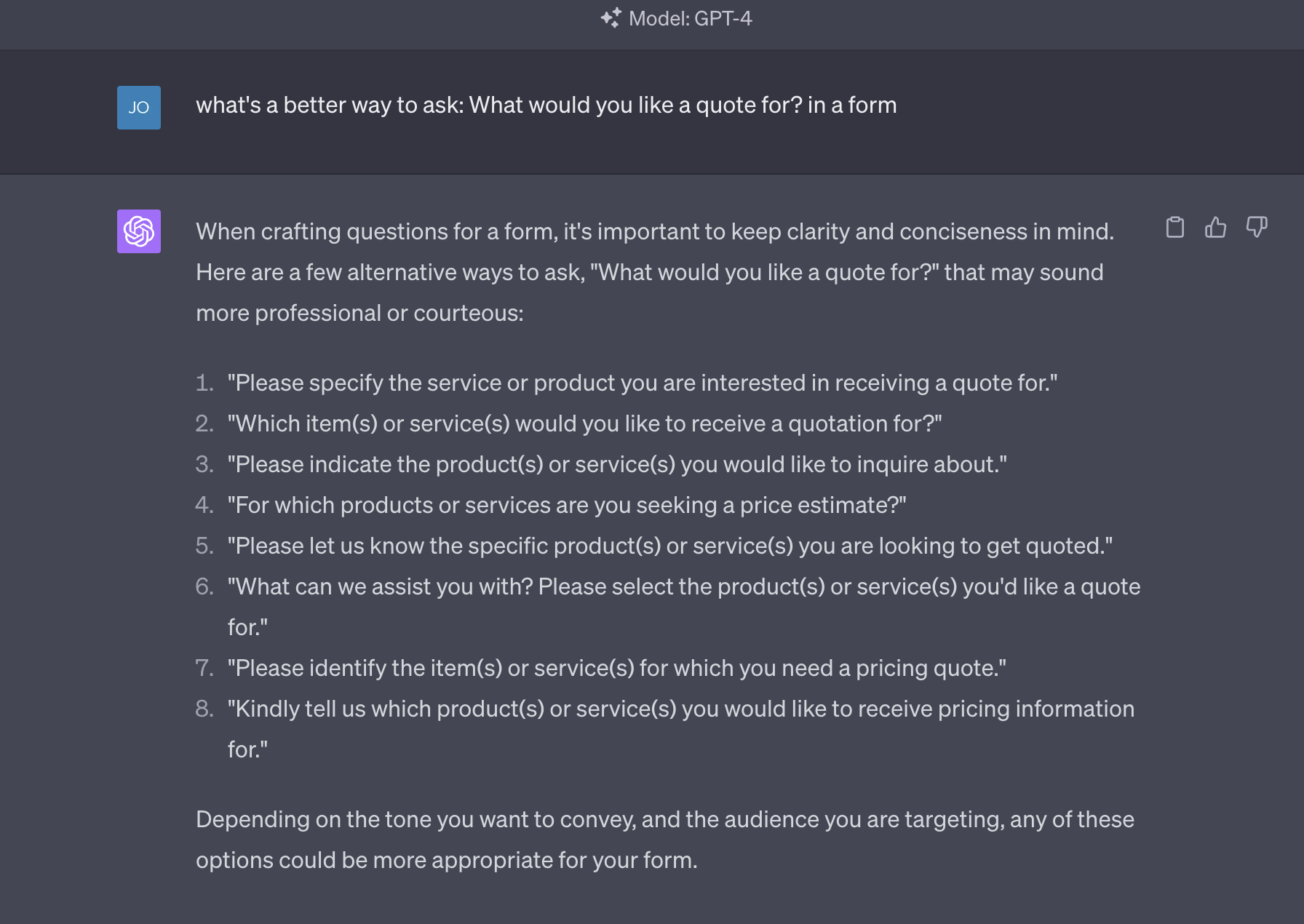 Earlier in this post, I emphasized the importance of being specific with your prompts. However, in this particular case, I found myself at a loss and in need of some brainstorming. I simply wanted to establish a starting point for exploring alternative ways to phrase this question.