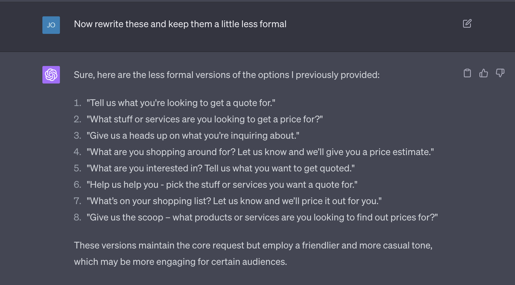 Moving on, I decided to prompt ChatGPT again, specifically asking it to rewrite the headlines while maintaining a more casual tone. By doing so, we can create copy that is not only concise but also resonates with the audience in a more approachable manner. Let’s see what ChatGPT comes up with this time.