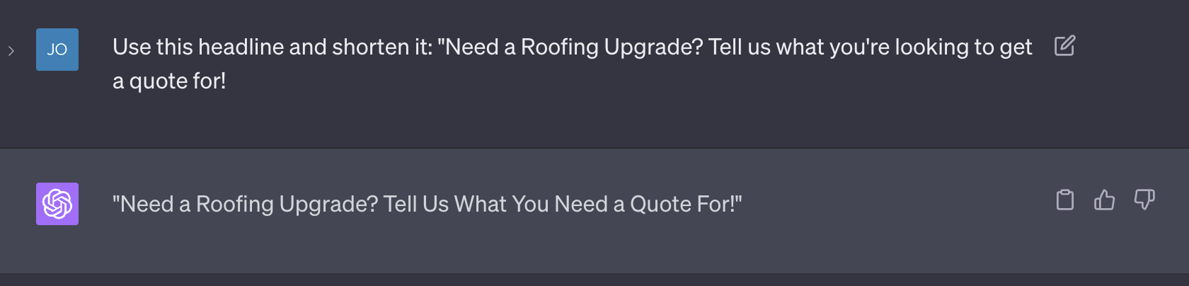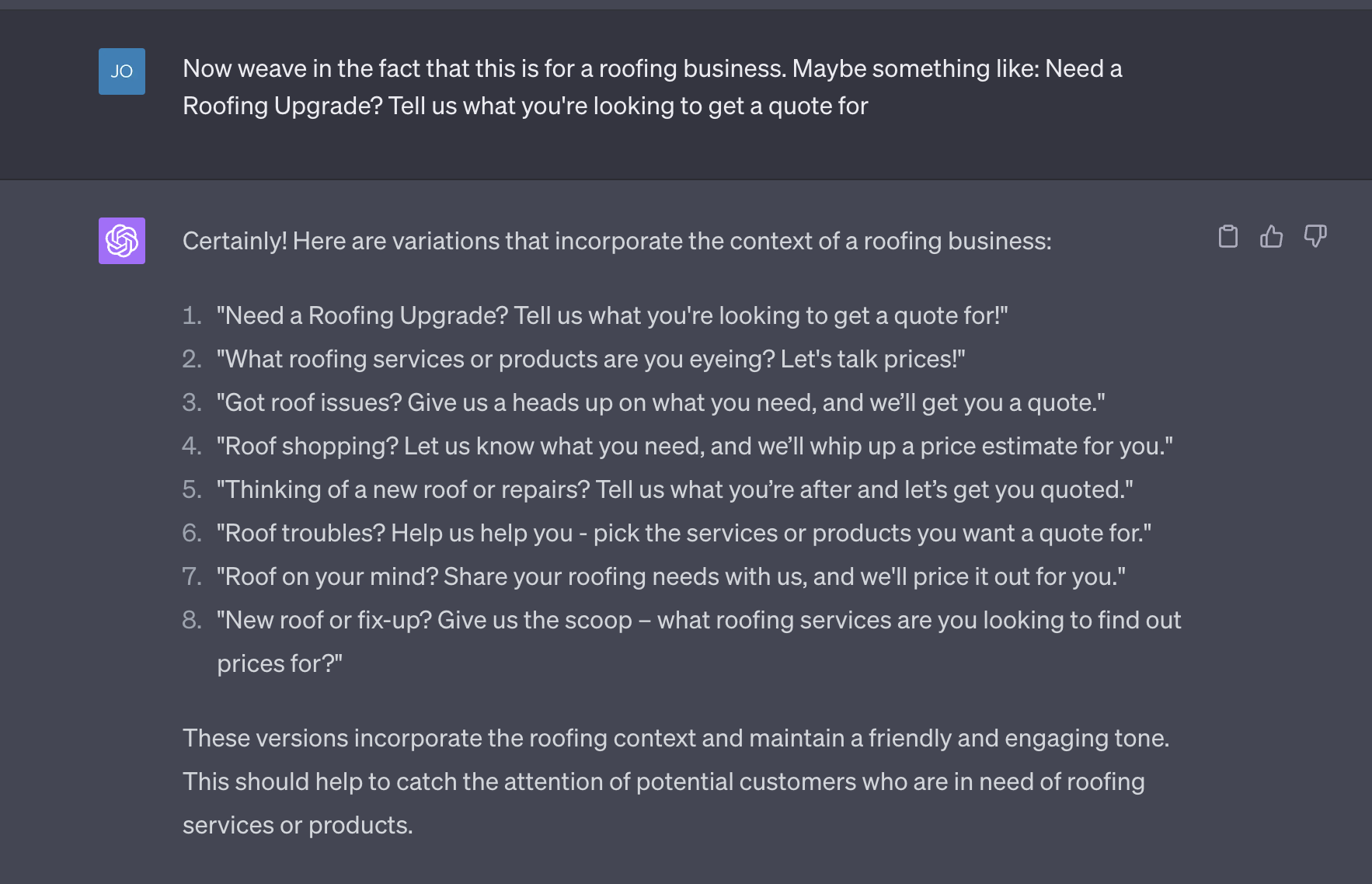 So next, I asked ChatGPT to rewrite the above again, this time focusing more on roofing to make the form more align with what the prospect is looking for.